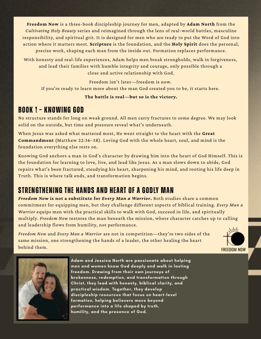 Freedom Now is not a substitute for Every Man a Warrior. Both studies share the same heart for equipping men, but they challenge different aspects of biblical training. Every Man a Warrior, by Lonnie Berger, equips men with the practical skills to walk with God, succeed in life, and spiritually multiply. Freedom Now, by Adam North, goes deeper—it’s where leadership and healing meet. It restores the man beneath the mission so his strength is no longer driven by pride or performance, but by the presence of God within him. This is where character catches up to calling, where humility becomes strength, surrender becomes power, and the heart of a man is forged to stand in the gap for those he has been called to lead and protect. Because when a man’s heart, soul, and mind are truly surrendered, his leadership flows naturally from humility, not pride—from freedom, not the faithless control that ruins what God is trying to build. Freedom Now and Every Man a Warrior are not in competition—they’re two sides of the same mission. One builds the hands of a leader; the other heals the heart behind them.